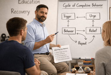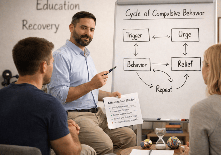 Our education component provides structured psychoeducation tailored to each case. Patients learn how compulsive behaviors form and persist, how triggers and stress responses interact, and which skills reduce urges. We reinforce learning through practice assignments, progress tracking, and relapse prevention planning.